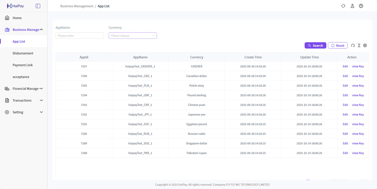 The merchant’s appId and secret key are paired, distinguished by currency, and differentiated between the test environment and the production environment.